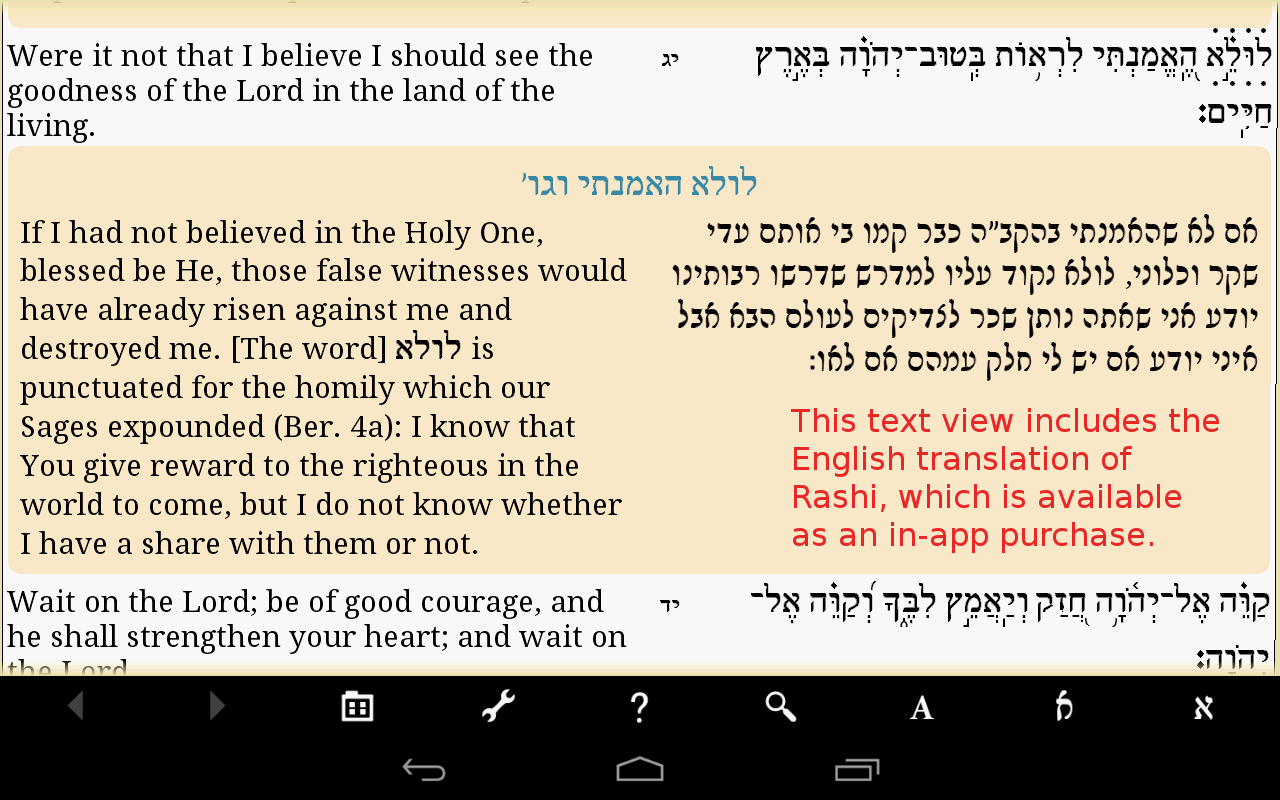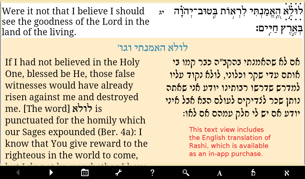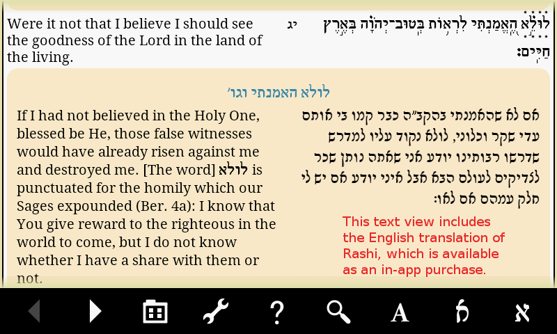 The Judaica Press English translation of Rashi on Tanach is available as an in-app purchase! This translation includes many added explanatory notes and references to expand your understanding of both Rashi's commentary and the Tanach. You can now study Rashi in two easy-to-view parallel columns of Hebrew and English.