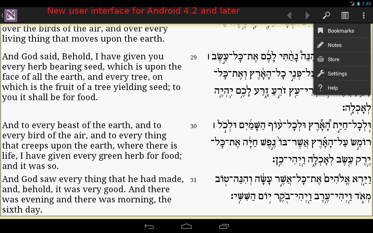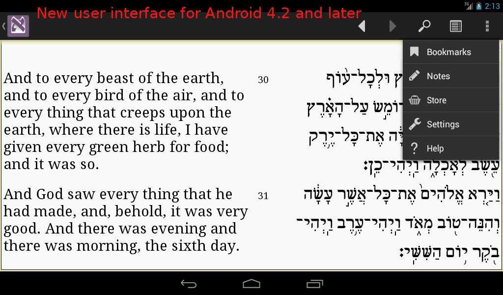Tanach Bible is available for all Android versions. For users with devices running Android 4.2 or later, an entirely new user interface with many enhancements has been added. The new user interface includes more text views, a cursor for native editing in the search box, new icons, an improved help section with a table of contents and quick start guide, and more flexible navigation within the app.