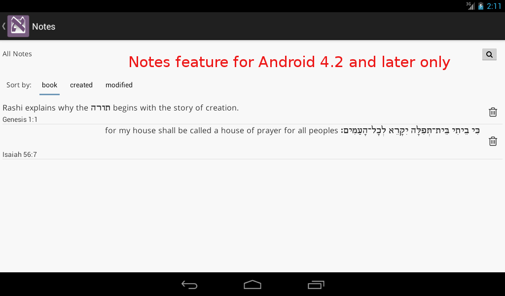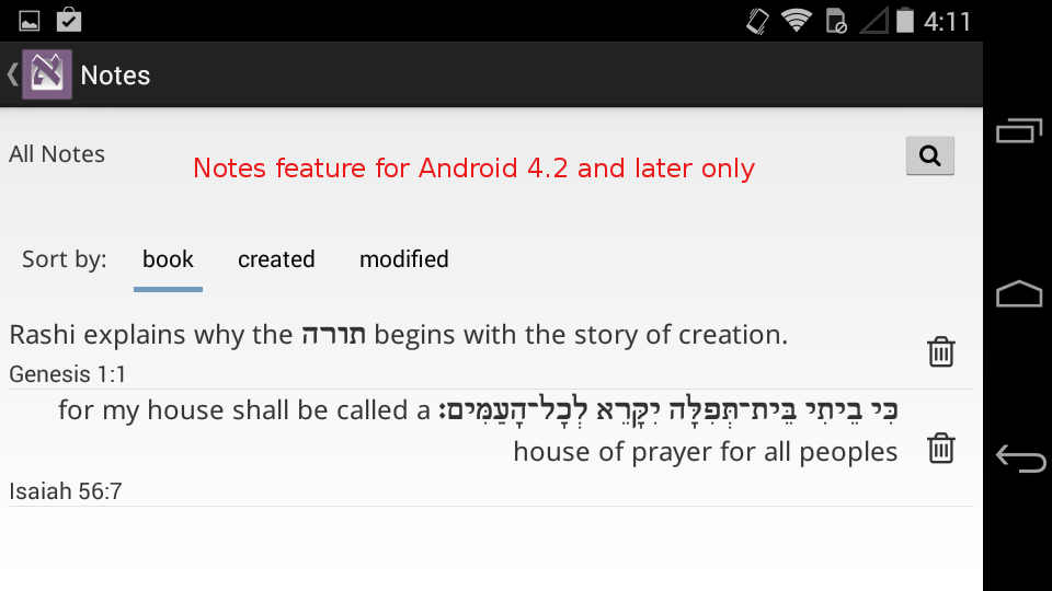 • Add a note to a verse, search and sort notes (Android 4.2 and later only)